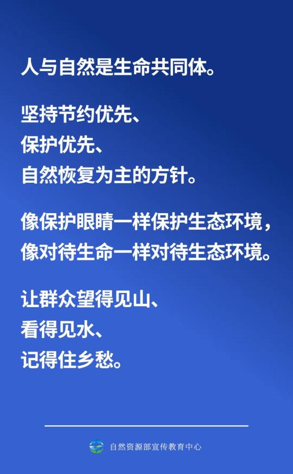 在整个发展过程中,我们都要坚持节约优先、保护优先、自然恢复为主的方针,不能只讲索取不讲投入,不能只讲发展不讲保护,不能只讲利用不讲修复,要像保护眼睛一样保护生态环境,像对待生命一样对待生态环境,多谋打基础、利长远的善事,多干保护自然、修复生态的实事,多做治山理水、显山露水的好事,让群众望得见山、看得见水、记得住乡愁,让自然生态美景永驻人间,还自然以宁静、和谐、美丽。